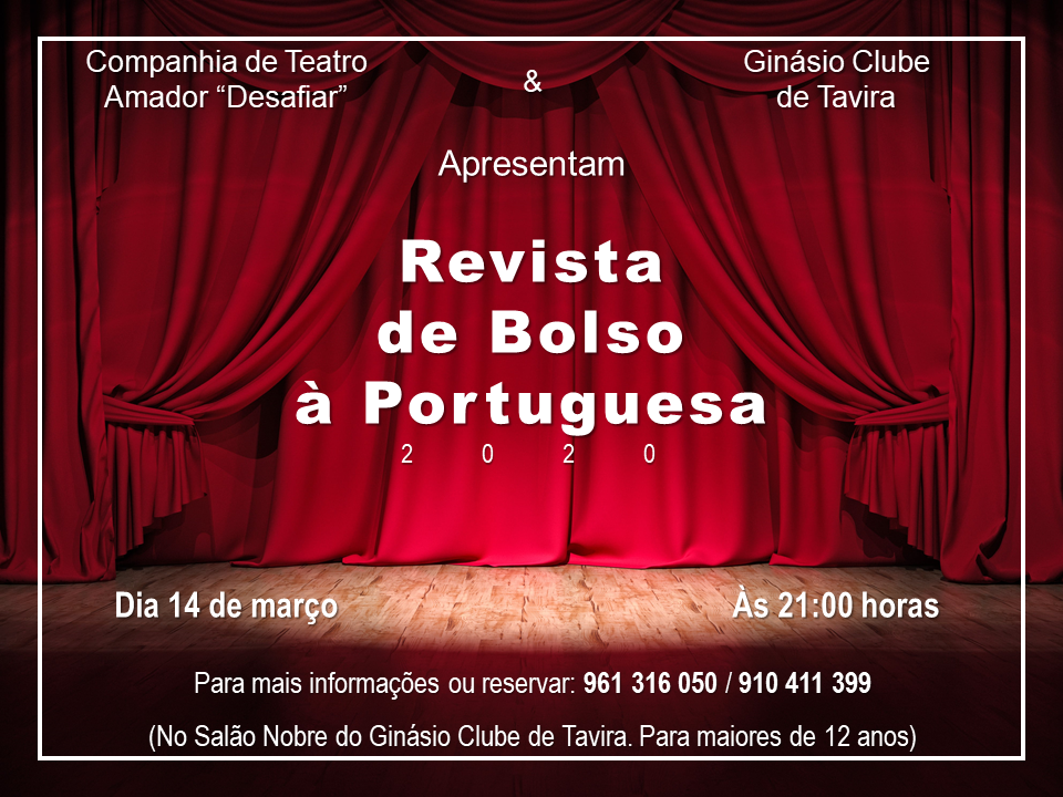 O Salão Nobre do Ginásio Clube de Tavira será palco, no próximo dia 14 a partir das 21 horas, do espetáculo "Revista de Bolso à Portuguesa 2020", numa sessão realizada em parceria com a Companhia de Teatro Amador "Desafiar".